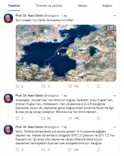 Prof. Dr. naci görür yaptığı açıklamada paylaştığı harita ile uyarılarda bulundu. Görür'ün harita ile yaptığı deprem Van ve çevresindeki değişimler gösterildi.Görür uyarısında "Arkadaşlar, dünden beri Van Gölü'nün doğusu hareketli. Arısu-Tuşba/Van, Çitören-Tuşba/Van, Mollakasım/ Van yörelerinde 2,0-3,5 aralığında depremler oluyor. Bu depremler gölün doğusundaki bindirme fayları ile ilgili. Burası yavaş yavaş yükseliyor. Biliyorsunuz Van ilimiz deprem kenti. Tarihsel dönemlerde çok sayıda şiddeti VI-IX arasında değişen deprem var. Aletsel dönemde bu bölgede 1976 7,3 Çaldıran ve 2011 7,2 Van Depremi var. Şu anda olan depremler yerleri itibariyle daha büyük depremleri tetikleyebilir diye beni pek endişelendirmiyor." ifadelerini kullandı.
