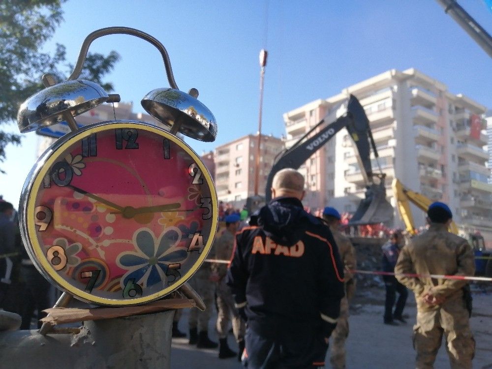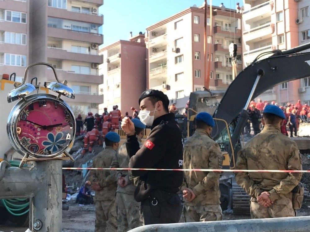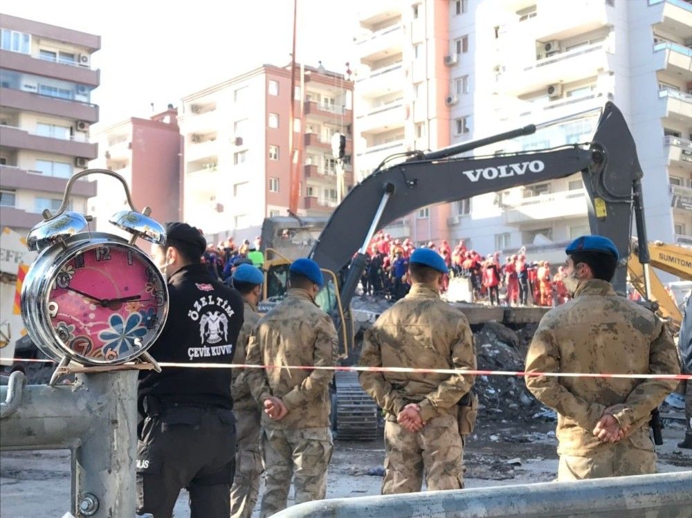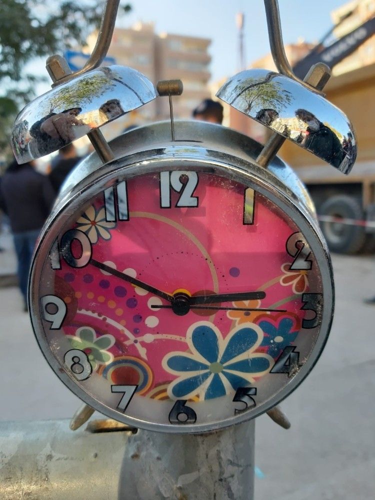 Çok sayıda kişinin cansız bedeninin çıkarıldığı binadan bir çocuğa ait olduğu düşünülen masa saati de çıkartıldı. O saatin, depremin meydana geldiği 14.51'de durduğu görüldü.