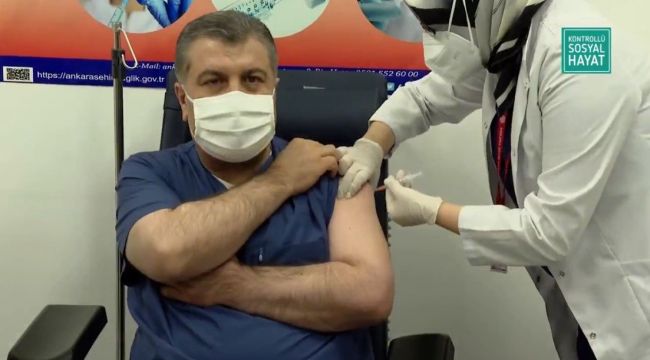 Acil Kullanım Onayı verilmesinin ardından ilk CoronaVac aşısı, Ankara Şehir Hastanesi'nde Sağlık Bakanı Koca'ya yapıldı.