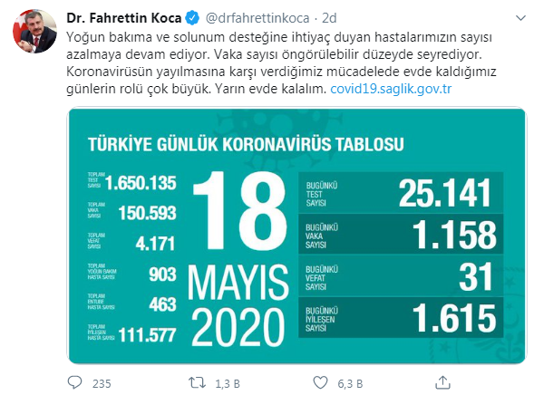 Koca'nın paylaştığı görsele göre toplam vaka sayısı ise 150 bin 593 oldu.