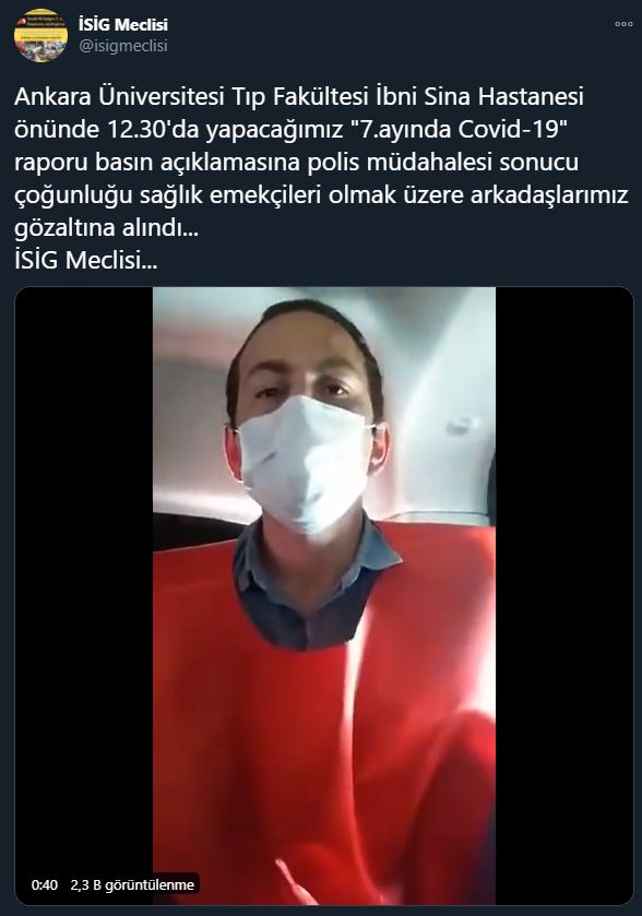 Görüntüyü paylaşan Bağımsız Maden İş Sendikası Örgütlenme Uzmanı Başaran Aksu'nun verdiği bilgiye göre 7 kişi gözaltına alındı. İşçi Sağlığı ve İş Güvenliği Meclisi de Twitter adresinden görüntüyü paylaşarak "Ankara Üniversitesi Tıp Fakültesi İbni Sina Hastanesi önünde 12.30'da yapacağımız '7. ayında Covid-19' raporu basın açıklamasına polis müdahalesi sonucu çoğunluğu sağlık emekçileri olmak üzere arkadaşlarımız gözaltına alındı..." diye yazdı.