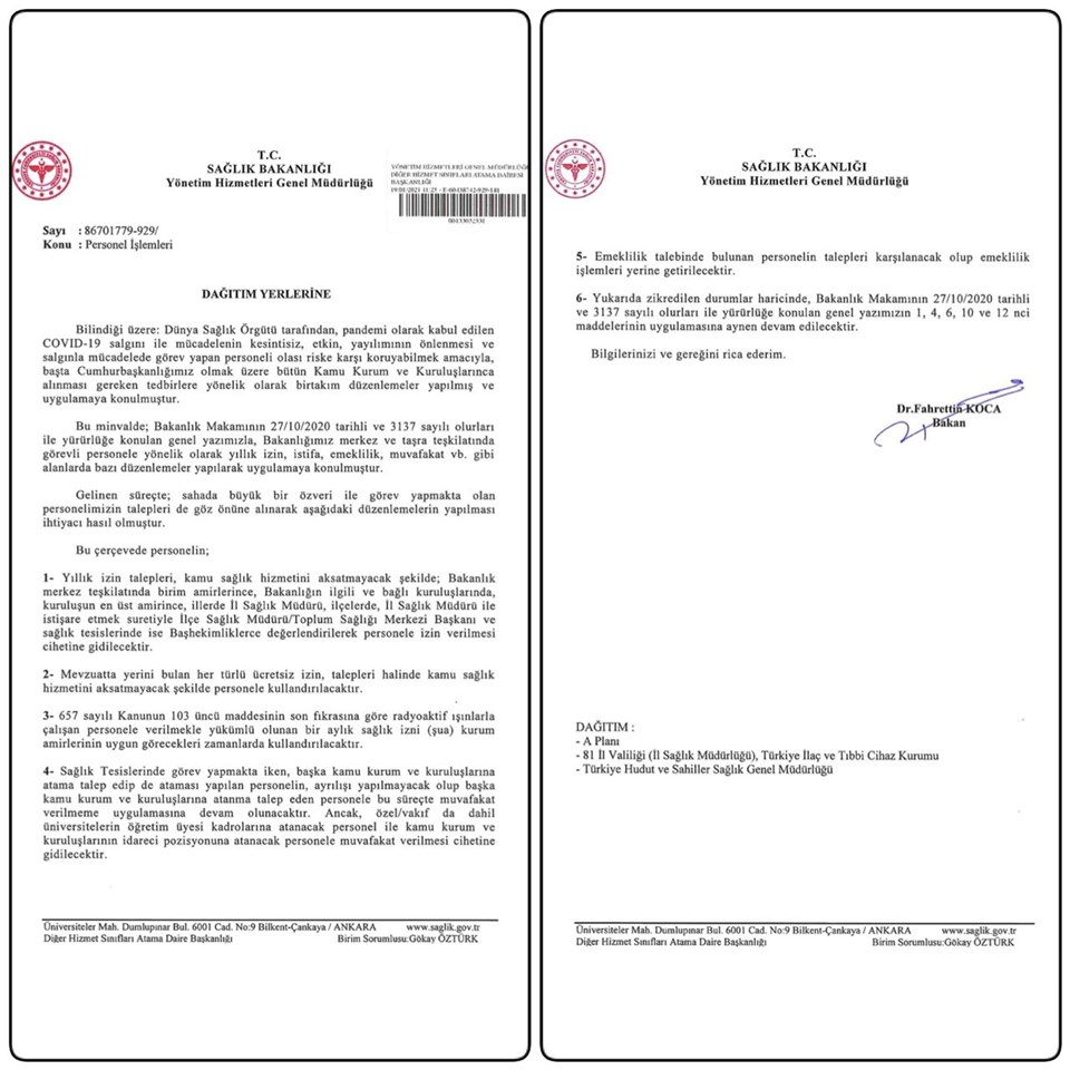 Bakanlıkça, corona virüs pandemisi dolayısıyla sağlık çalışanlarına yönelik olarak, izin ve emeklilik işlemleri kısıtlaması getirilmişti.