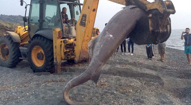 Seferihisar'da, karaya yaklaşık 900 kilo ağırlığında köpek balığı vurdu.