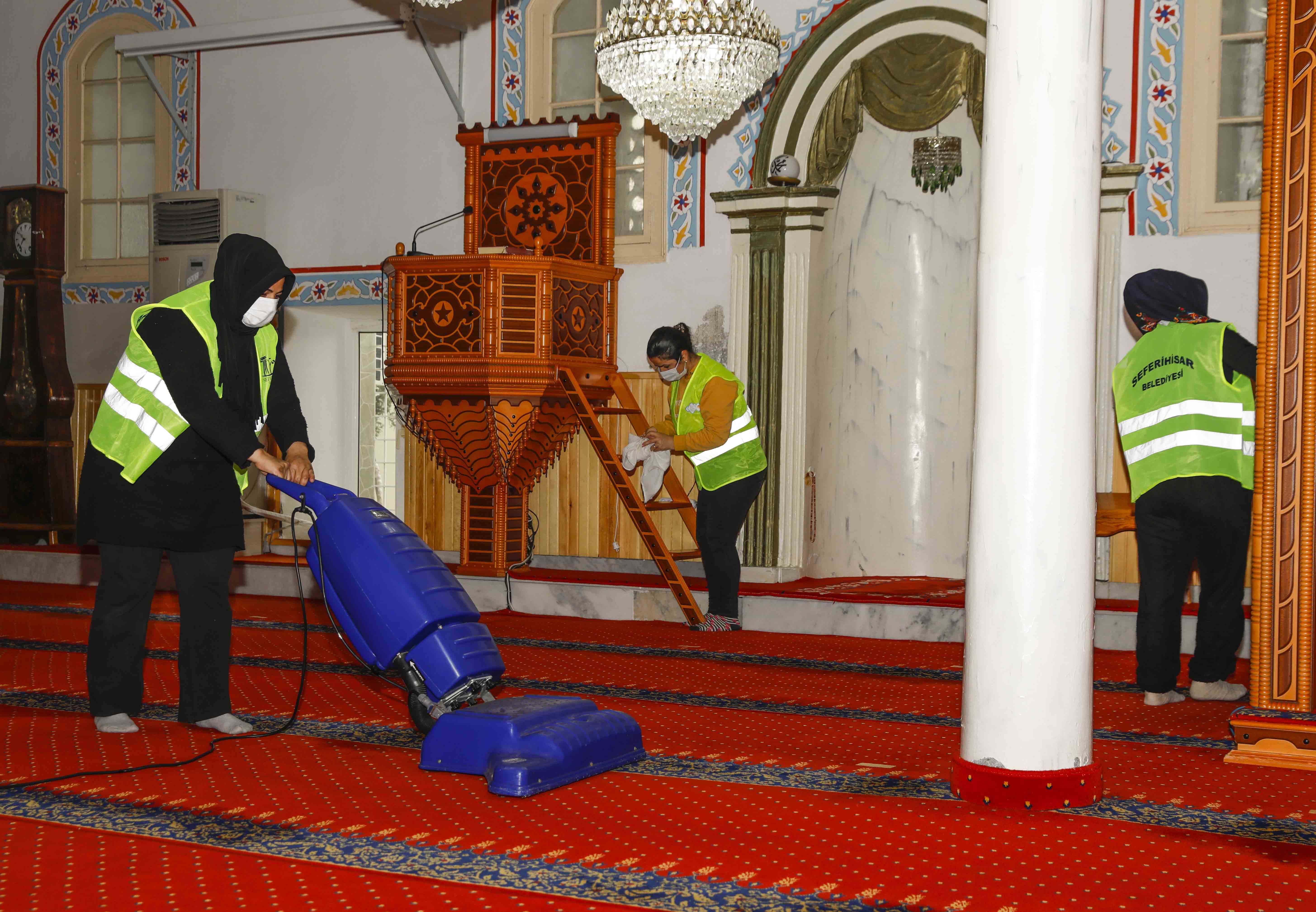 Seferihisar merkez ve köylerdeki camilerde başlatılan çalışmada halılar hijyenik koşullarda yıkanıp kurutulurken camilerin genel temizliği de gerçekleştiriliyor.