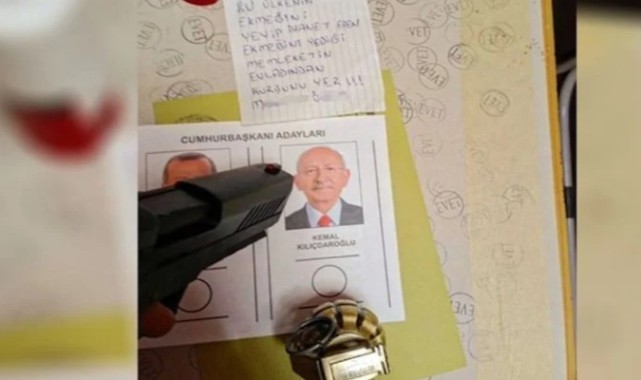 umhurbaşkanlığı 2.tur seçiminde oy kullanma işlemleri devam ediyor. Birçok ilde sandıklarda usulsüzlükler yaşanırken, Rize'nin Fındıklı ilçesinde bir kişinin oy kabinine silah ve el bombasıyla girdiği tespit edildi.EL BOMBASI VE SİLAHLA OY KABİNİNE GİRDİEl bombası ve silahla oy kabinine girdikten sonra Millet İttifakı Cumhurbaşkanı adayı Kemal Kılıçdaroğlu'nun fotoğrafına silah doğrultan şahıs, ‘Bu ülkenin ekmeğini yiyip ihanet eden ekmeğini yediği memleketin evladından kurşun yer” şeklinde tehdit içerikli mesajı oy pusulasının üzerine koyarak fotoğraf çekti.GÖZALTINA ALINDIOy kabininde çektiği fotoğrafı sosyal medya hesabından paylaşan M. Ö şikayet üzerine gözaltına alındı.