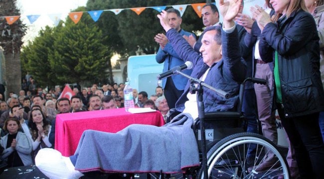 İZMİR'de bir hafta önce seçim çalışmasından gece evine dönerken silahlı saldırıya uğrayan AK Parti Selçuk Belediye Başkan adayı Osman Başterzi, ameliyattan sonra alçılı ayağı ile miting yaptı.
