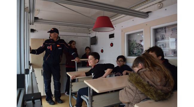 Afet ve Acil Durum Yönetimi Başkanlığı (AFAD)'na ait deprem simülasyon tırı, deprem farkındalığına dikkat çekmek için İzmir'in Aliağa ilçesinde eğitimler verdi. Tırda birebir depremi yaşayan öğrenciler heyecanlı dakikalar yaşadı.