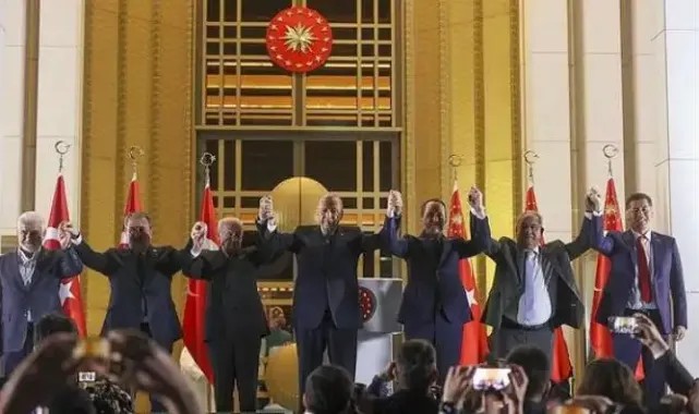 Cumhurbaşkanlığı seçimlerinin ikinci turunu yüzde 52,16 oyla kazanan AKP Genel Başkanı ve Cumhurbaşkanı Erdoğan, Cumhur İttifakı liderlerini külliyede ağırladı. “Balkon konuşması” yapan Erdoğan, muhalefete yüklendi.Görüşmeye MHP Genel Başkanı Devlet Bahçeli, BBP Genel Başkanı Mustafa Destici, HÜDA PAR Genel Başkanı Zekeriya Yapıcıoğlu, DSP Genel Başkanı Önder Aksakal, ATA İttifakı’nın cumhurbaşkanı adayı Sinan Oğan, Cumhurbaşkanı Yardımcısı Fuat Oktay, Cumhurbaşkanlığı İletişim Başkanı Fahrettin Altun, Cumhurbaşkanlığı Sözcüsü İbrahim Kalın, AKP Sözcüsü Ömer Çelik katıldı.OĞAN VE YAPICIOĞLU AYNI KAREDE Emine Erdoğan hemen Erdoğan'ın yanında yer alırken; Fuat Oktay, HÜDAPAR Genel Başkanı Zekeriya Yapıcıoğlu ve birinci turda ATA İttifakı'nın cumhurbaşkanı adayı olan sinan oğan da Erdoğan'ın arkasında bulundu. Ayrıca MHP Genel Başkanı Devlet Bahçeli, Yeniden Refah Partisi Genel Başkanı Fatih Erbakan, Büyük Birlik Partisi Genel Başkanı Mustafa Destici, Demokratik Sol Parti Genel Başkanı Önder Aksakal da balkonda yer aldı."BİR ÜLKÜCÜYÜ KESSENİZ HÜDAPAR İLE AYNI SANDIĞA GİRMEZ"Cumhur İttifakı'na desteğini açıklamadan önce “Bir ülkücüyü kesseniz dahi HÜDAPAR ile aynı sandığa girmez” diyen Sinan Oğan'ın Yapıcıoğlu ile aynı karede yer alması dikkat çekti.Odatv.com