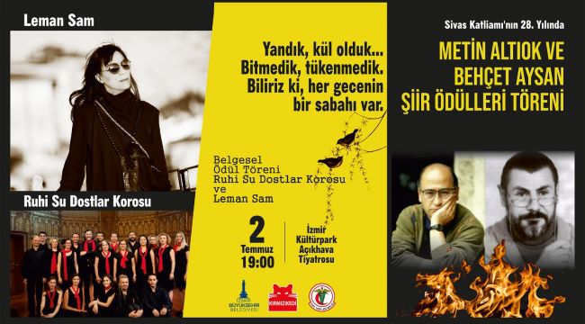 İzmir Büyükşehir Belediyesi, Türk Tabipler Birliği ve Kırmızı Kedi Yayınları işbirliğiyle Sivas Katliamı’nın 28. yıldönümünde Madımak Oteli’nde katledilen aydınları 2 Temmuz Cuma günü anacak. kültürpark Açıkhava Tiyatrosu’ndaki anma programı 20.00’de Meral Altıok Odabaşoğlu ve Tuncer Yığcı’nın okuyacağı şiirlerle başlayacak. Gecede şair metin altıok ve Behçet Aysan’ın adlarına düzenlenen şiir yarışmasının ödül töreni yapılacak. Pandemi nedeniyle geçen yıl ödüllerini alamayan şairler de bu yıl yapılacak törende ödüllerini alacak. Metin Altıok ve Behçet Aysan’ı anlatan “İki Yol Arkadaşı” belgeselinin ilk gösteriminin ardından Ruhi Su Dostlar Korosu ile Leman Sam konser verecek.