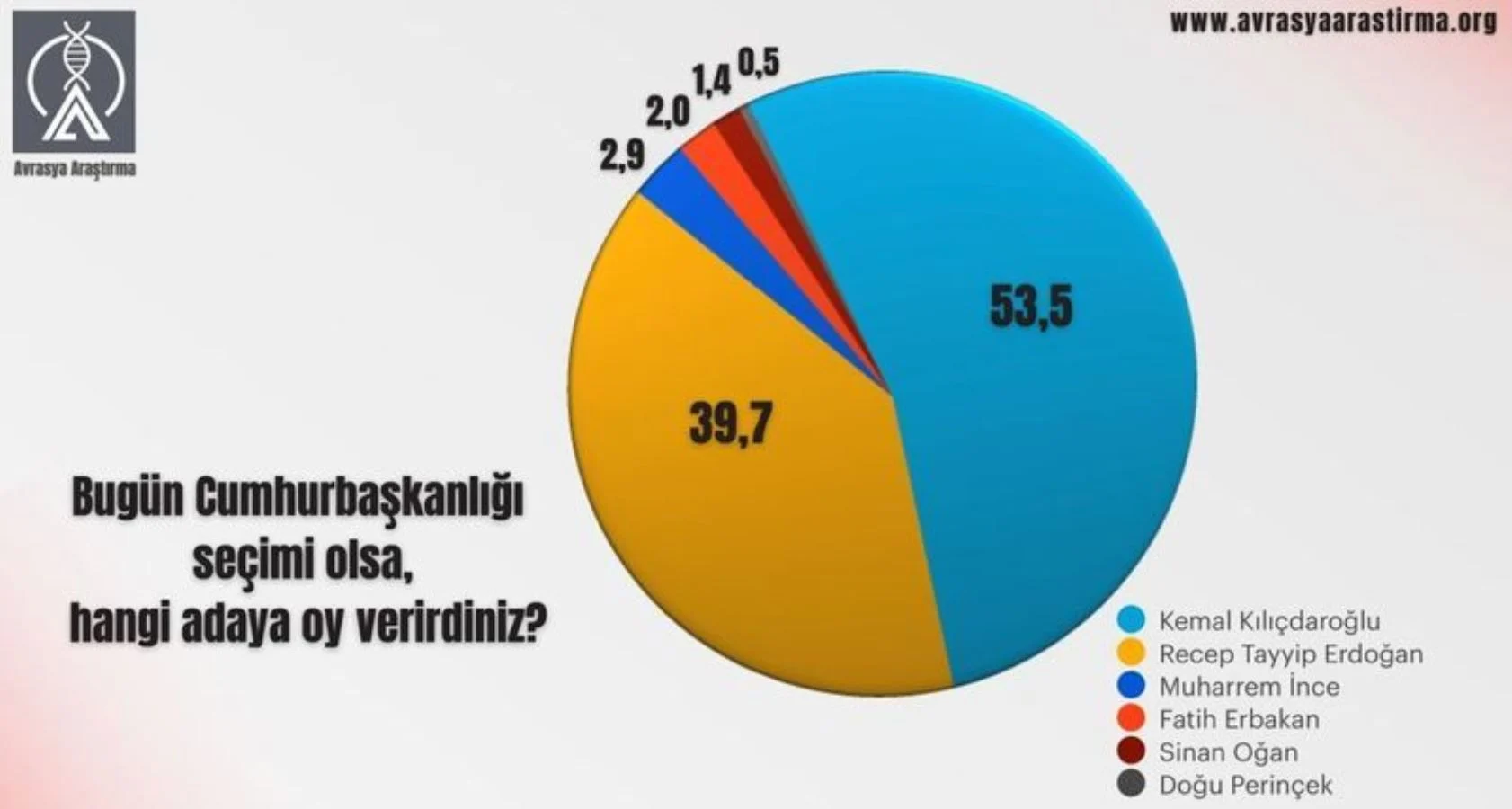 'Bugün Cumhurbaşkanlığı seçimi olsa hangi adaya oy verirsiniz?' sorusunda çıkan oranlar şöyle:Kemal Kılıçdaroğlu: 53.5Recep Tayyip Erdoğan: 39.7