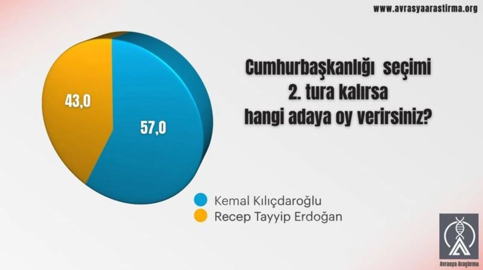 Ankette ayrıca Kılıçdaroğlu ile Erdoğan’ın 2. tura kalması durumunda yüzde kaç oy alacağı da soruldu.Buna göre: Kılıçdaroğlu yüzde 57Erdoğan yüzde 43 oranında oy alıyor.Avrasya Araştırma’nın anketine göre ittifak oy oranları da şöyle: Millet İttifakı yüzde 46,7; Cumhur İttifakı yüzde 36,3; Emek ve Özgürlük İttifakı yüzde 11,8; diğer ittifaklar yüzde 5,2.