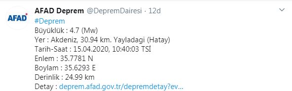 Hatay’da AFAD verilerine göre 4.7 şiddetinde deprem oldu. Deprem çevre illerden de hissedildi.