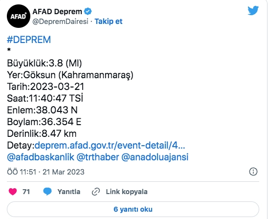 Gündem 21 Mart 2023 - 12:05 Son dakika...Kahramanmaraş'ta 3.8 büyüklüğünde deprem! AFAD Deprem Dairesi, Kahramanmaraş'ın Göksun ilçesinde saat 11.40'ta 3.8 büyüklüğünde deprem meydana geldiğini kaydetti. Gündem 21 Mart 2023 - 12:05 Yorumlar TAKİP ET Dinle Yazdır A Büyüt A Küçült Yorumlar Afet ve Acil Durum Yönetimi Başkanlığı (AFAD) deprem Dairesi, Kahramanmaraş'ın Göksun ilçesinde saat 11.40'ta 3.8 büyüklüğünde deprem meydana geldiğini duyurdu.Depremin yerin 8.47 kilometre derinliğinde yaşandığı kaydedildi. # deprem# sondakika# kahramanmaraş YORUMLAR adlı kullanıcıya cevap x Gönder İlginizi Çekebilir İZBETON soruşturmasında villa detayı! Şikayet dilekçesi ortaya çıktı Bornova Belediye Başkanı Eşki'nin serbest bırakılmasına savcılıktan itiraz Başkan Eşki'nin ifadesi ortaya çıktı! Mahkemeden Meslek Fabrikası için kritik karar: Delil tespiti kısmen kabul edildi, Cemil Tugay fabrikaya girdi Son Haberler Çağatay Güç: “Videolarında kendilerini yalanlamışlar” Başkan Tugay: Enerji güvenliği için şehirler kendi sistemlerini kurmalı Bu kütüphane sadece çocuklar için İzmir Körfezi’nde kirlilik alarmı: Aynı tehdit 11. kez görüldü Başkan Tugay: Binalara göz koymak yerine yapacağınız tonla iş var Bakan Özer duyurdu! 4 ilde eğitim kademeli olarak başlıyor! Bakan Özer duyurdu! 4 ilde eğitim kademeli olarak başlıyor!