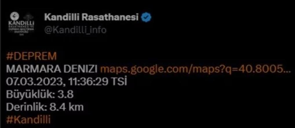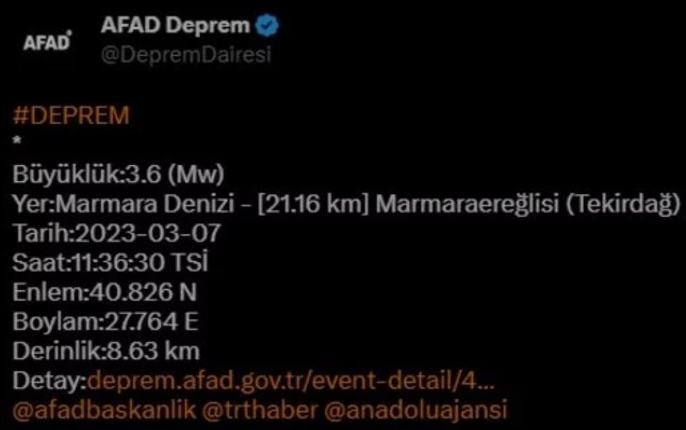 Marmara Denizi'nde 3.6 büyüklüğünde bir deprem meydana geldi.Avrupa-Akdeniz Sismoloji Merkezi (EMSC), saat 11.36'da meydana gelen depremin merkez üssünün Tekirdağ'a 21 kilometre uzaklıkta olduğunu duyurdu. Sarsıntı, Marmara Denizi'nin 5 kilometre altında gerçekleşti.AFAD, depremin büyüklüğünü 3.6 olarak açıklarken derinliğini 8.63 km olarak paylaştı. Kandilli Rasathanesi ise depremin büyüklüğünü 3.8 olarak duyurdu.