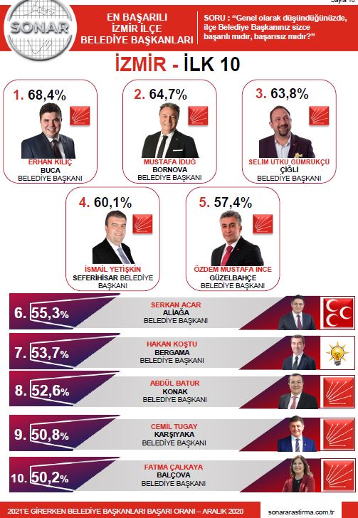 Genel ortalamada cinsiyet ve yaş kotalarının, Türkiye İstatistik Kurumu’nun tespitleri ve verileri doğrultusunda yürütüldüğü çalışmada, toplam 66 bin 120 anket yapıldı. Çalışma nüfusu yüksek olan 20 büyükşehirde farklı sosyo-ekonomik ve sosyo-demografik gruba mensup kişiler ile gerçekleştirildi. İlçe belediye başkanları için seçmene “genel olarak düşündüğünüzde ilçe belediye başkanınız sizce başarılı mıdır, başarısız mıdır?” sorusu yöneltildi. Buna göre, İzmir’in en başarılı ilçe belediye başkanı yüzde 68,4 oranıyla Buca Belediye Başkanı erhan kılıç oldu.