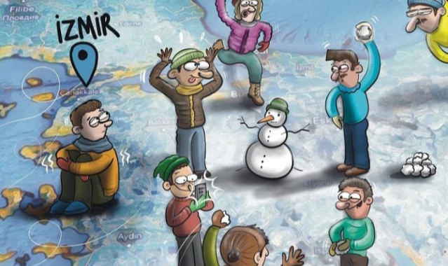 Türkiye haritası üzerinde tüm şehirlerde kar topu oynayarak eğlenen; ancak İzmir'de üşüyen vatandaşı gösteren karikatür çok sayıda kişi tarafından paylaşıldı.