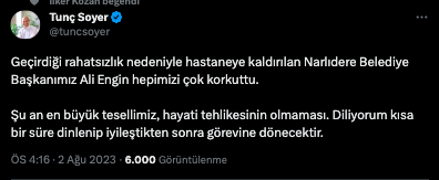 İZMİR GÜNDEMİ- Narlıdere Belediye Başkanı Ali Engin’in, öğlen saatlerinde beynine pıhtı atması şüphesiyle hastaneye kaldırılmasının ardından İzmir Büyükşehir Belediye Başkanı Tunç Soyer'den açıklama geldi.Başkan Engin'in sağlık durumu hakkında açıklama yapan Başkan Soyer, "Geçirdiği rahatsızlık nedeniyle hastaneye kaldırılan Narlıdere Belediye Başkanımız Ali Engin hepimizi çok korkuttu. Şu an en büyük tesellimiz, hayati tehlikesinin olmaması. Diliyorum kısa bir süre dinlenip iyileştikten sonra görevine dönecektir" dedi.