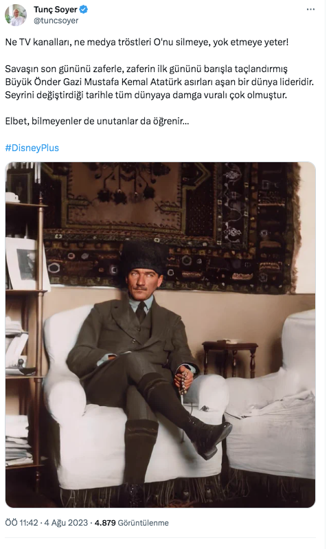 DisneyPlus'ın "Atatürk" dizisini yayınlamama kararı gündemde geniş yankı yaratırken, karara ilişkin bir tepki de İzmir Büyükşehir Belediye Başkanı Tunç Soyer’den geldi.Başkan Soyer, sosyal medya hesabında DisneyPlus’ı etiketleyerek ‘Ne TV kanalları, ne medya teröstleri O'nu silmeye, yok etmeye yeter!’ sözleriyle tepkisini ortaya koydu.Savaşın son gününü zaferle, zaferin ilk gününü barışla taçlandırmış Büyük Önder Gazi Mustafa Kemal Atatürk’ün asırları aşan bir dünya lideri olduğunu vurgulayan Soyer, Atatürk’ün seyrini değiştirdiği tarihle tüm dünyaya damga vuralı çok uzun bir zaman olduğuna dikkat çekti.Öte yandan Soyer ‘Elbet, bilmeyenler de unutanlar da öğrenir’ dedi.İşte o paylaşım: