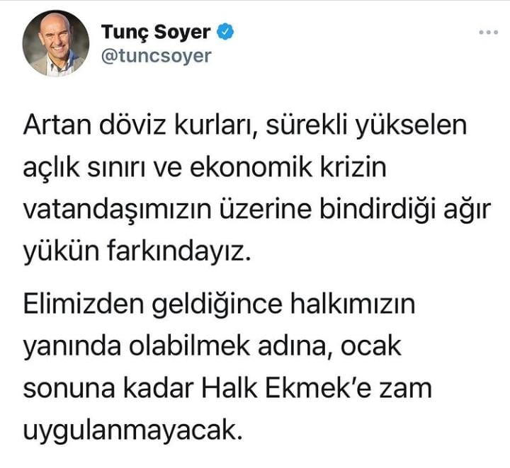 İzmir'de 230 gram ekmeğin fiyatının 2.5 liraya çıktığı günlerde mecliste 'halk ekmek' için 'direnme' mesajı veren İzmir Büyükşehir Belediye Başkanı tunç soyer zam yapmama kararını sosyal medya hesabından yaptığı açıklamayla resmileştirdi. Soyer açıklamasında "Artan döviz kurları, sürekli yükselen açlık sınırı ve ekonomik krizin vatandaşımızın üzerine bindirdiği ağır yükün farkındayız. Elimizden geldiğince halkımızın yanında olabilmek adına, ocak sonuna kadar Halk Ekmek’e zam uygulanmayacak" ifadelerine yer verdi.