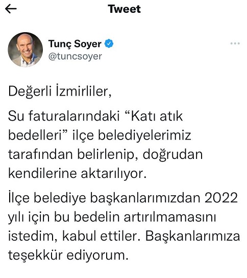 Başkan Soyer, su faturalarındaki katı atık bedellerinin 2022 yılında ilçe belediyelerince zam yapılmaması konusunda karar verildiğini sosyal medya hesabından yaptığı paylaşımla duyurdu. Başkanlar tarafından bu teklifin kabul edildiğini belirten Soyer, şu ifadeleri kullandı; ''Değerli İzmirliler, su faturalarındaki “Katı atık bedelleri” ilçe belediyelerimiz tarafından belirlenip, doğrudan kendilerine aktarılıyor. İlçe belediye başkanlarımızdan 2022 yılı için bu bedelin artırılmamasını istedim, kabul ettiler. Başkanlarımıza teşekkür ediyorum.''