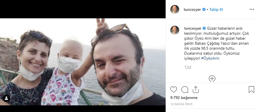 Geçtiğimiz günlerde babasından alınan iliğin %98.5 uyumlu olması ve uzun aradan sonra tekrardan dışarıya çıkabilecek duruma gelerek tekrardan tüm Türkiye'nin yüreğine umut eken Öykü Arin ile ilgili bir paylaşım da Tunç Soyer yaptı. İşte Tunç Soyer'in İnstagram paylaşımı...