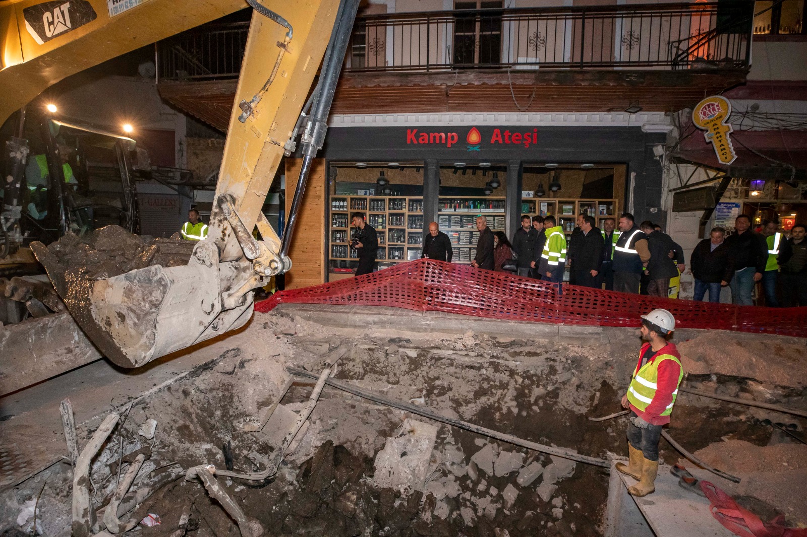 Kemeraltı’nda esnafın işlerini aksatmamak için çalışmaları gece sürdürdüklerini belirten Başkan Tunç Soyer, “Kemeraltı'nın 50 yıllık sorununu çözüyoruz. Çok zor ve büyük bir çalışma. Sokakların altındaki bütün altyapıyı değiştiriyoruz. Altyapının ardından yol yüzeyini taşla kaplıyoruz. kemeraltı esnafımız bu süreçte sıkıntı çekiyor. Vatandaşlar da alışveriş yaparken tabii ki sıkıntı yaşıyor. Ama bu büyük adımı atmazsak Kemeraltı'nın o hayalini kurduğumuz güzel günlerine ulaştırmamız mümkün değil” dedi.