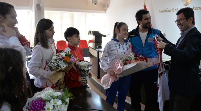 Bergama Belediyespor’un içlerinde Balkan Şampiyonu ve Türkiye Şampiyonluklarında madalyalar kazanan sporcularında bulunduğu Badminton ve finale kalan U-14 kız takımının da bulunduğu Basketbol takımı sporcuları Başkan Gönenç’i ziyaret ederek çiçek yağmuruna tuttular. Badminton antrenörü Hakan Avcı ve Basketbol Antrenörü Can Kayalarlıoğulları öncülüğünde gerçekleşen ziyarette çocuklar Başkan Gönenç’e başkanlığı boyunca kendilerini hiçbir zaman yalnız bırakmadıkları içinde teşekkür ettiler.