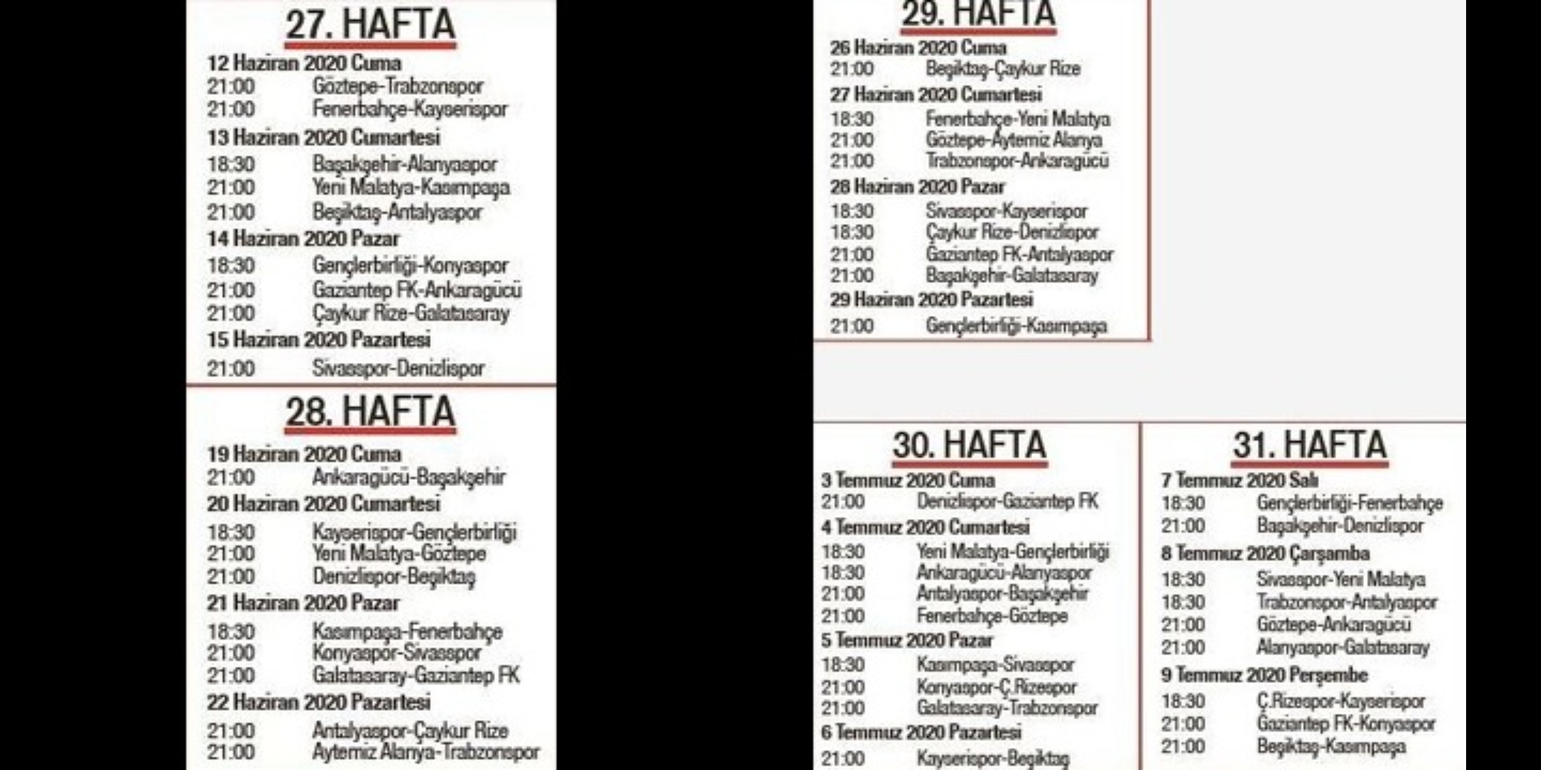 Açıklanan 5 haftalık program içerisinde 29. haftada 28 Haziran Pazar günü 21.00'de Başakşehir-G.Saray ve 30. haftada yine aynı saatte 5 Temmuz Pazar günü oynanacak Galatasaray- Trabzonspor maçları şampiyonluğun kaderini belirleyecek.