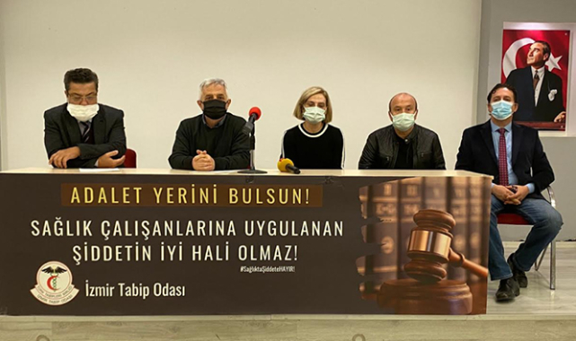 Açıklamanın ardından konuşan İzmir Tabip Odası Başkanı Lütfi Çamlı ise, “Gördük ki pandemi sürecinde bile sağlıkta şiddet durmadı. Arık şiddet dursun diyoruz. Burada da en önemli noktalardan biri şiddetin cezasız kalmaması ve uygulanacak cezalarda erteleme ya da indirim yapılmaması oldukça önemlidir. Şiddet uygulayan sanığın küçük cezalara mahkum olması ve bunun da ertelenmesi ya da tamamen cezasız kalması hem vicdanlarda ciddi yaralara ol açmakta hem de bu tür fiillerin kolaylıkla tekrarlanmasına yol açmaktadır. Saldırıda şiddete uğrayan hekim arkadaşımızın annesi, babası, dayısı da hekimdir ve bu olaydan büyük bir şekilde etkilendiler” dedi. ŞİDDET HUKUKİ KARARLILIKLA ÇÖZÜLÜR
