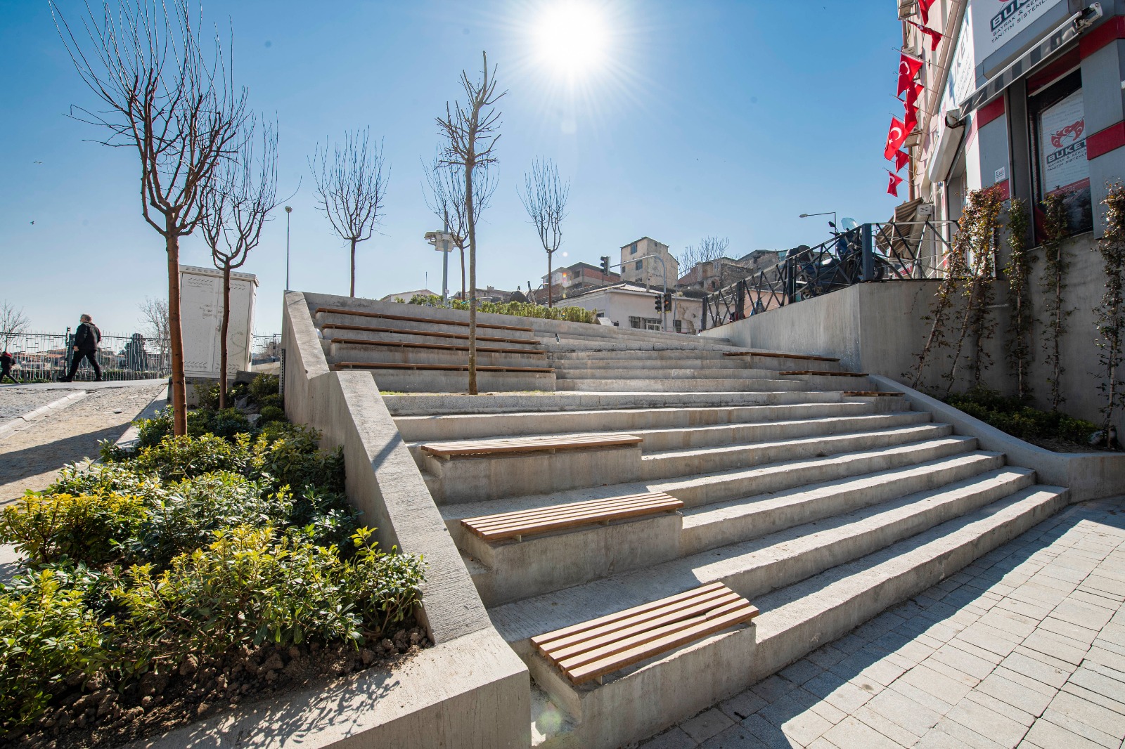 Park ve Bahçeler Dairesi Başkanlığı da alanda ağaç ve bitkilendirme çalışması yaptı. 5 süs elması, 2 gül hatmi, 1 çınar ağacı, çalı grubundan 138 papatya ve pitos çalısı ile sarmaşık dikilerek Azizler Sokağı’nda yeşil doku oluşturuldu.
