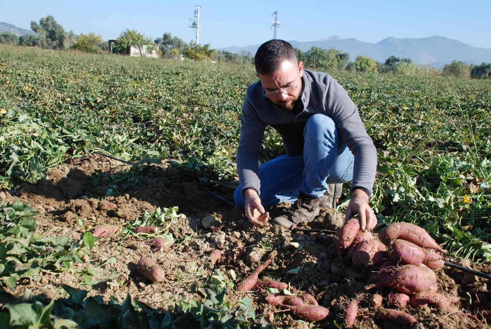 İzmirli üretici, ithal edilen ve raflarda kilosu 40 TL'ye satılan tatlı patatesleri torbalı ilçesinde üretti. 15 dönümlük alanda kırmızı ve mor cins tatlı patates üreten ve hasadını gerçekleştirecek olan genç üretici Şerafettin Baba, "Ürünü görünce pancar ya da turp sanan oluyor ama aslında hiçbir benzerliği yok. İsmi tatlı patates ama tadı patatese değil daha çok kestaneye benziyor" dedi.