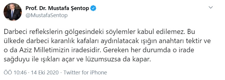 Darbeci reflekslerin gölgesindeki söylemler kabul edilemez. Bu ülkede darbeci karanlık kafaları aydınlatacak ışığın anahtarı tektir ve o da Aziz Milletimizin iradesidir. Gereken her durumda o irade sağduyu ile ışıkları açar ve lüzumsuzsa da kapar.