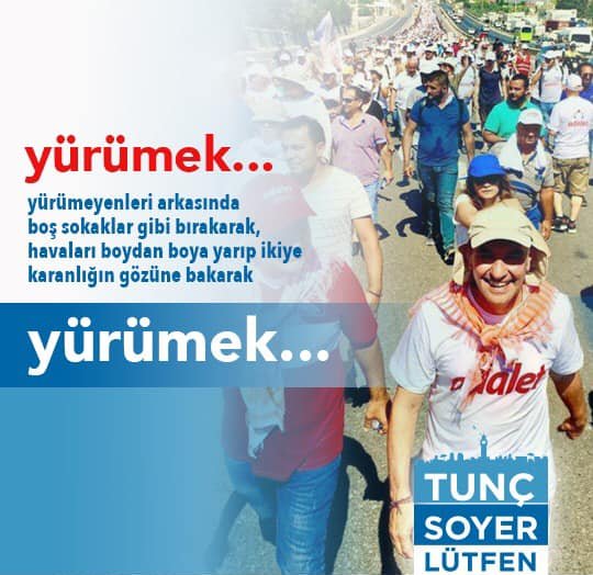 Seferihisar Belediye Başkanı ve chp İzmir Büyükşehir Belediye Başkan Aday Adayı Tunç Soyer'in destekçilerinden "Adalet Yürüyüşü" temalı şiir paylaşımı geldi.. Cumnuriyet Halk Partisi Genel Başkanı Kemal Kılılçdaroğlu tarafından gerçekleştirilen "Adalet Yürüyüşü" vurgulu açıklama yapan tunç soyer destekçileri, fotoğraf paylaştı. İşte o paylaşım: