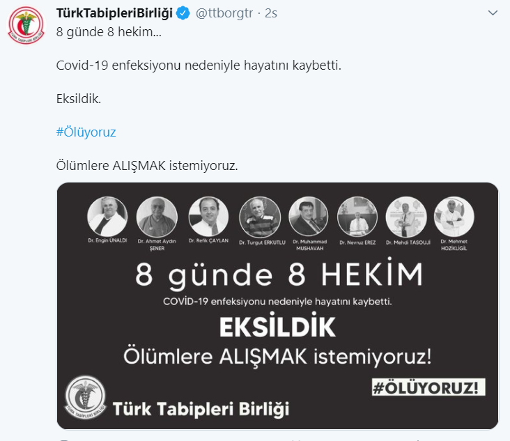 Türk Tabipleri Birliği, '8 günde 8 hekim Covid-19 enfeksiyonu nedeniyle hayatını kaybetti.