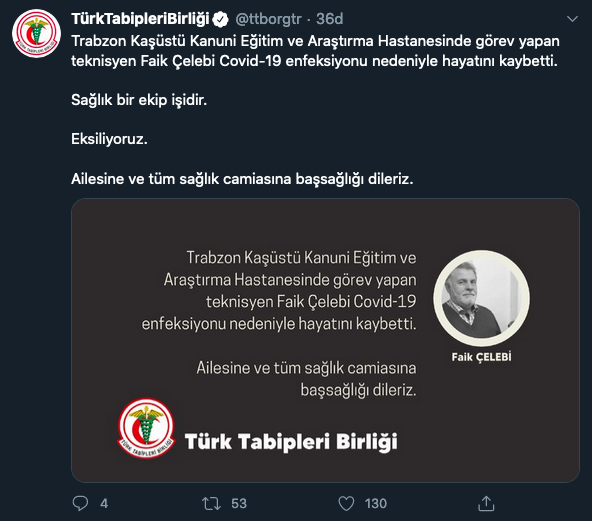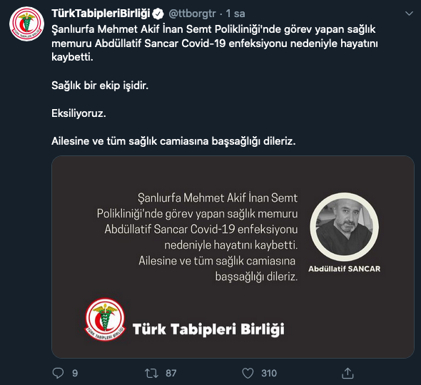 "Şanlıurfa Mehmet Akif İnan Semt Polikliniği'nde görev yapan sağlık memuru Abdüllatif Sancar covid-19 enfeksiyonu nedeniyle hayatını kaybetti. Sağlık bir ekip işidir. Eksiliyoruz. Ailesine ve tüm sağlık camiasına başsağlığı dileriz" "Trabzon Kaşüstü Kanuni Eğitim ve Araştırma Hastanesinde görev yapan teknisyen Faik Çelebi Covid-19 enfeksiyonu nedeniyle hayatını kaybetti. Sağlık bir ekip işidir. Eksiliyoruz. Ailesine ve tüm sağlık camiasına başsağlığı dileriz."
