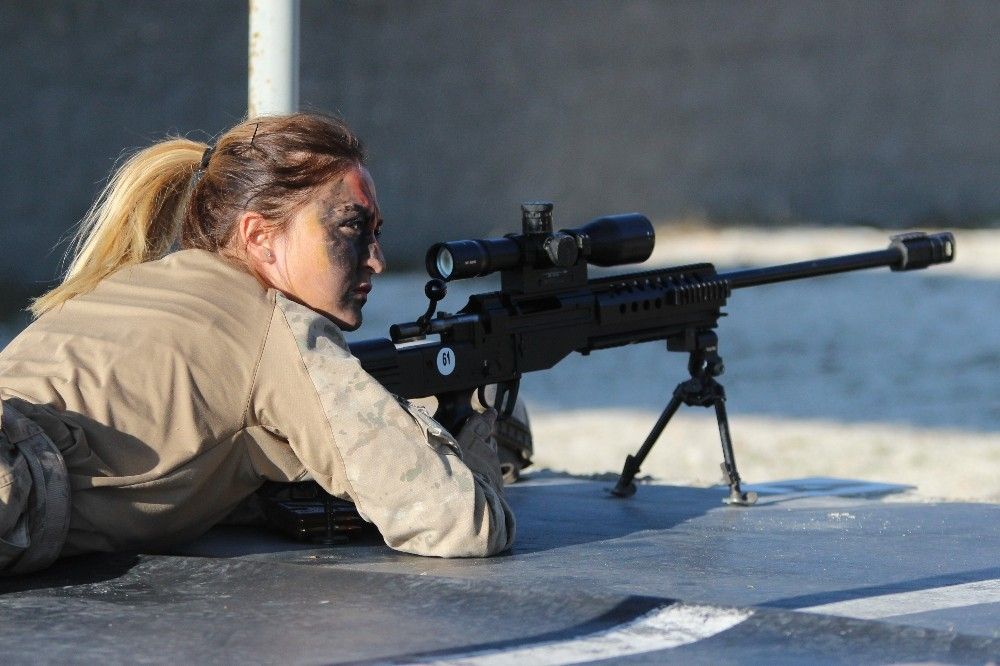 Kadın Jandarma Komando Astsubayların zorlu eğitimlerinin bir parçası da keskin nişancılık. Keskin nişancılık eğitimlerini yerli ve milli imkanlarla üretilen Bora-12 keskin nişancı tüfeği ile alan kursiyerler, her türlü arazi şartına uygun askeri kamuflajlarla doğada adeta gözden kayboluyorlar. Özel kamuflajlarıyla, düşmana kendilerini göstermeden hedef bölgeye sızma eğitimi alan kadın komandolar, yapılan atışların ardından yine kamufle olarak bölgeden uzaklaşıyor.