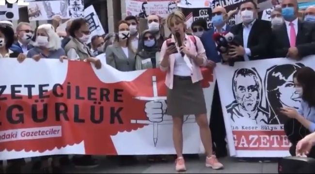 “Son 10 yılda defalarca olduğu gibi yine bir gazeteci davası için bir aradayız. İçi boş bir iddianame ile gazeteciler Silivri’de tutsaklar. Tezgahla, tuzaklar birbirini izledi. Meslektaşlarımızın özgürlüğü elinden alınırken asıl mesaj bizlere, dışardaki gazetecilereydi. Bizleri de susturmak, korkutmak istiyorlar. Musa Anter’in, Uğur Mumcu’nun Metin Göktepe’nin sustuğunu gördünüz mü? Asla. Kavgamız da sevdamız da dayanışmayla sürecek. Yargıçlardan adil olmalarını ve meslektaşlarımızı serbest bırakmalarını istiyoruz. Onlar tutukluyken hiçbirimiz özgür değiliz.”