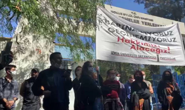 Bugün öğlen saatlerinde, Buca'daki dokuz eylül Üniversitesi İktisadi ve İdari Bilimler Fakültesi önünde toplanan, İzmir Üniversite Dayanışması ve Yurtsuzlar adlı grubun üyeleri, "Barınamıyoruz, Geçinemiyoruz, Hakkımızı Alacağız" yazılı pankart açtı. Üniversiteliler, bir kez daha barınma sorunlarına dikkat çekti. Okunan basın açıklamasında, "Üniversite öğrencileri olarak fahiş kira fiyatları ve niteliksiz, yetersiz, cinsiyetçi KYK yurtlarına karşı günlerdir sokaklardayız. Sırtımızda birer battaniyeyle bulunduğumuz kentlerin banklarında uyuyoruz. Bugün de üniversitemizin önünden sesimizi yükseltiyoruz. 2 yıla yakın süren pandemi süreciyle niteliksiz online eğitime mecbur bırakıldık. Ardından başvurduğumuz KYK yurtlarında 10 bininci yedekte kaldık. Fahiş kira fiyatları ile evsiz kaldık. Bazı arkadaşlarımız tüm bu nedenlerle kayıt dondurmak zorunda kaldı. Kazandığımız okulların bulunduğu şehirlere gelemediler" denildi."YURT KAPASİTESİ 16 BİN, ÖĞRENCİ SAYISI 200 BİNE YAKIN"