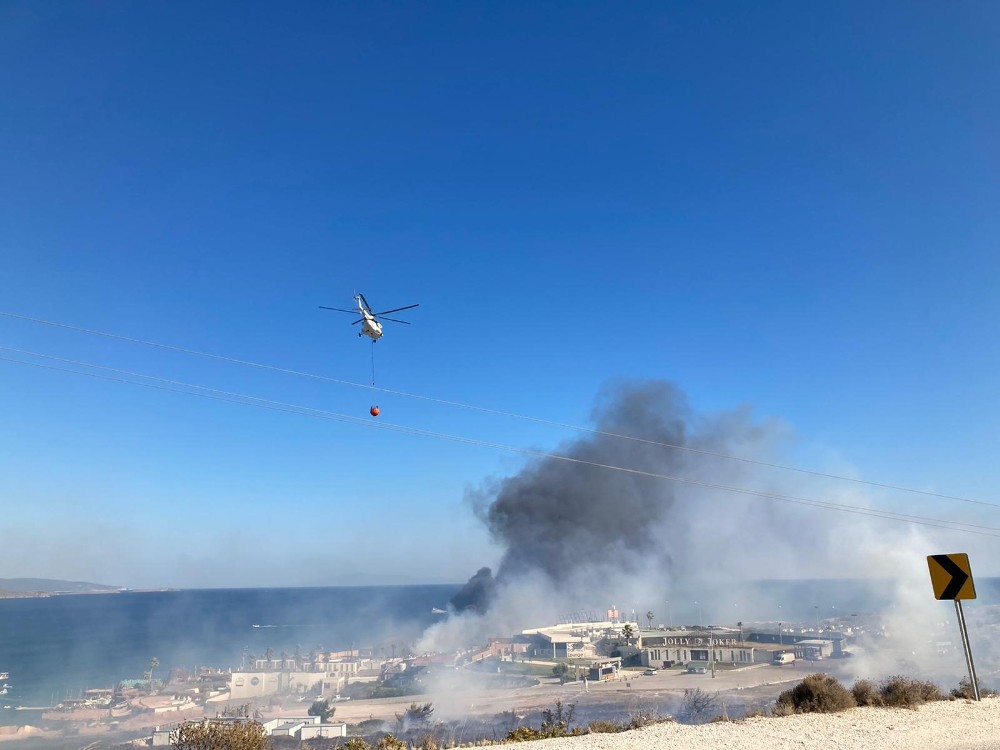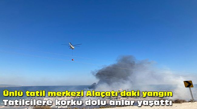Ünlü tatil merkezi Çeşme ilçesindeki Alaçatı'da otluk alandan yükselen alevler paniğe yol açtı. alaçatı Port yolu olarak belirtilen mevkide çıkan yangın, bölgede bulunan bazı işletmeleri de tehdit ederken, tatilciler korku doldu anlar yaşadı.