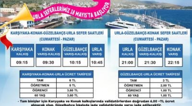 Son teknoloji gemilerle donattığı filosuyla deniz ulaşımında önemli hamleler gerçekleştiren İzmir Büyükşehir Belediyesi, vapur seferlerine yeni bir rota olarak Urla’yı da ekledi. Özel sefer kapsamında Cumartesi ve Pazar günleri sabah Karşıyaka'dan, akşam ise Urla'dan yapılacak seferlerin özellikle yaz döneminde büyük rağbet görmesi bekleniyor. 18 Mayıs'tan itibaren Cumartesi ve Pazar günleri olmak üzere yapılacak seferler için ilk hareket 09.15'te Karşıyaka İskelesi'nden olacak. Sırasıyla Konak ve Güzelbahçe'ye uğradıktan sonra 10.45'te Urla'da Büyükşehir Belediyesi'nin özel olarak yaptırdığı yüzer iskelede sefer tamamlanacak. Urla'dan İzmir'e dönüş seferi ise saat 21.00'de yapılacak. Sefer, Konak iskelesinde 22.15'te tamamlanacak.