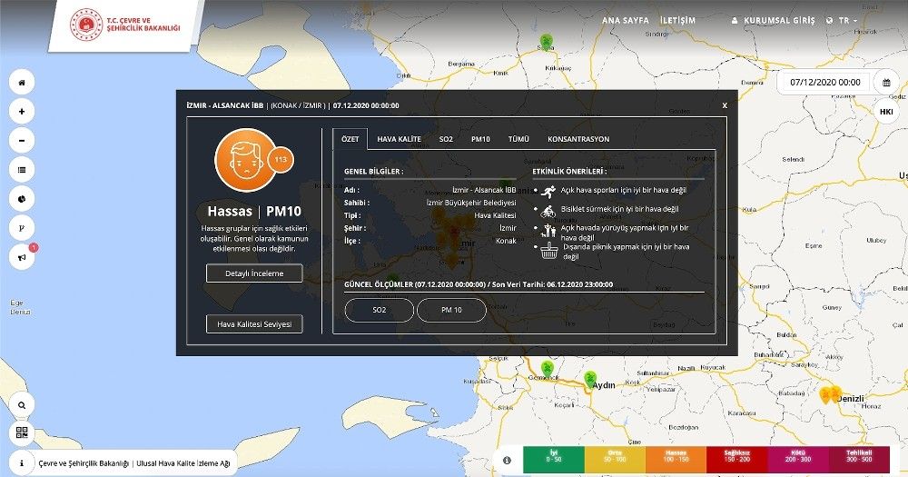 PM10 değerleri yine saatlik olarak en yüksek Afyon'da 200,86, Aydın'da 325,69, Balıkesir'de 473,32, Balıkesir merkez (MTHM) istasyonunda 420,91, Denizli Merkezefendi'de 433,13, Denizli Bayramyeri'nde 329,25, Manisa'da 70,17 ve Muğla'da 209,52 olarak kayıtlara geçti. 1 Kasım - 7 Aralık arasındaki zaman diliminin 24 saatlik ortalamasına bakıldığında ise PM10 miktarı oranının, Afyon, Balıkesir, Denizli, İzmir Alsancak, Gaziemir ve Şirinyer ile Muğla'da sınır değer olan 50'nin aşıldığı görüldü.