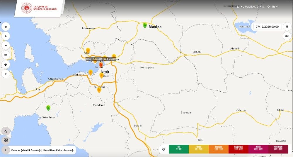 Ege Bölgesi, kasım ayı başından itibaren hava kirliliğiyle karşı karşıya kaldı. Çevre ve Şehircilik Bakanlığının, ülke genelindeki istasyonlardan alınan değerleri anlık olarak yayınladığı "Ulusal Hava Kalitesi İzleme Ağı" verilerine göre; Ege'de birçok istasyon raporlarında özellikle insan sağlığına olumsuz etkileri bulunan partiküler madde (PM10) sınır değerlerinin birçok kez aşıldığı görüldü. Ege'de, ölçüm yapılan istasyonların 1 Kasım'dan 7 Aralık'a kadar olan saatlik verilerine göre; PM10 miktarlarının sınır değerleri birçok kez aştığı dikkat çekti. Sınır değeri, 24 saat ortalaması 50 mikrogram/metreküp olması gereken PM10 değerleri, saatlik olarak yapılan ölçümlere göre en yüksek, İzmir Alsancak'ta 488,87, Çiğli'de 386,78, Güzelyalı'da 360,56, Şirinyer'de 248,57, Bayraklı'da 264,15, Gaziemir'de 211,52, Karşıyaka'da 206,95, Bornova'da ise 156,89 olarak ölçüldü.
