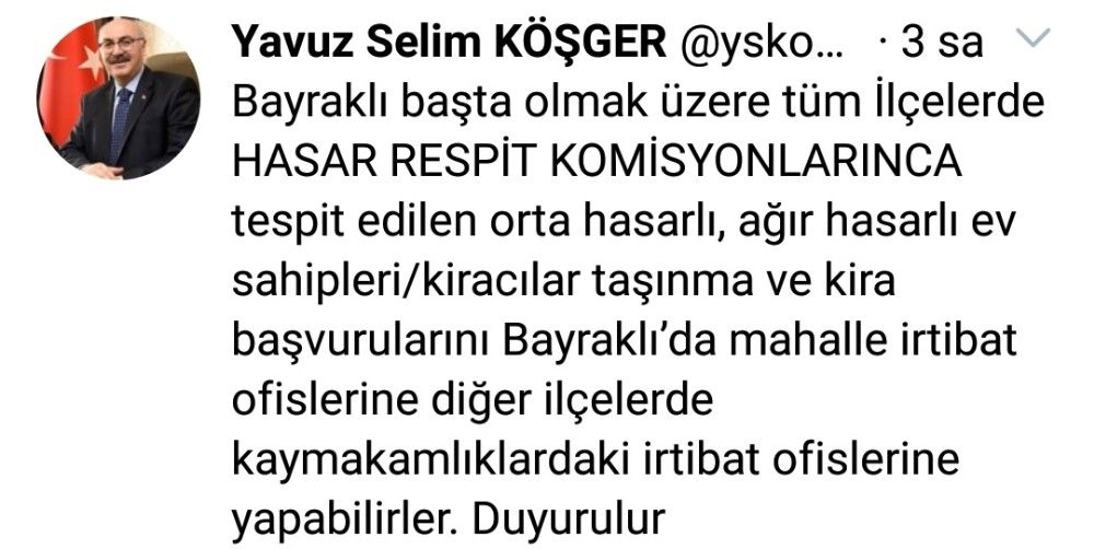 Köşger, sosyal medya hesabından şu paylaşımı yaptı; "Bayraklı başta olmak üzere tüm ilçelere hasar tespit komisyonlarınca tespit edilen orta ve ağır hasarlı ev sahipleri/kiracılar taşınma ve kira başvurularını Bayraklı'da mahalle irtibat ofislerine diğer ilçelerde kaymakamlık irtibat ofislerine yapabilirler."