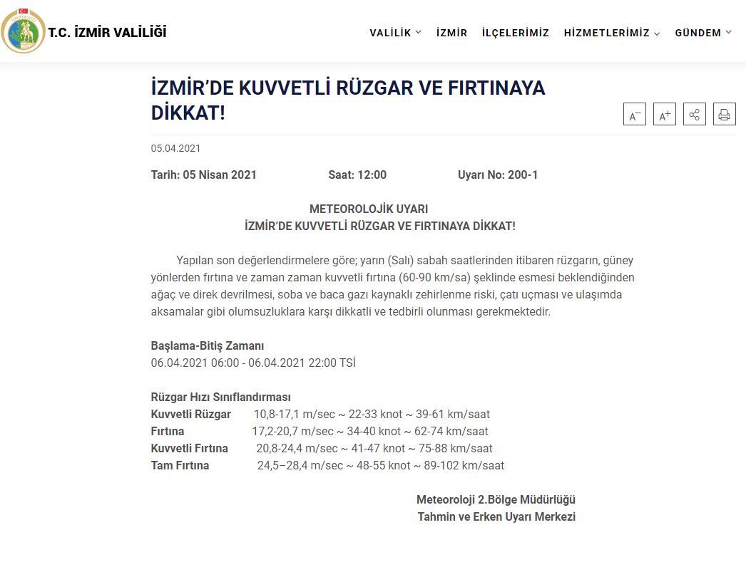 İzmir Valiliği, Meteoroloji 2. Bölge Müdürlüğü Tahmin ve Erken uyarı Merkezi'nden alınan bilgilere göre kentte yarın kuvvetli fırtına (60-90 km/sa) beklendiğini açıkladı. Rüzgarın yarın sabah saatlerinden itibaren etkili olacağı belirtilirken, ağaç ve direk devrilmesi, soba-baca gazı kaynaklı zehirlenme riski, çatı uçması ile ulaşımda aksamalar gibi olumsuzluklara karşı dikkatli ve tedbirli olunması istendi.
