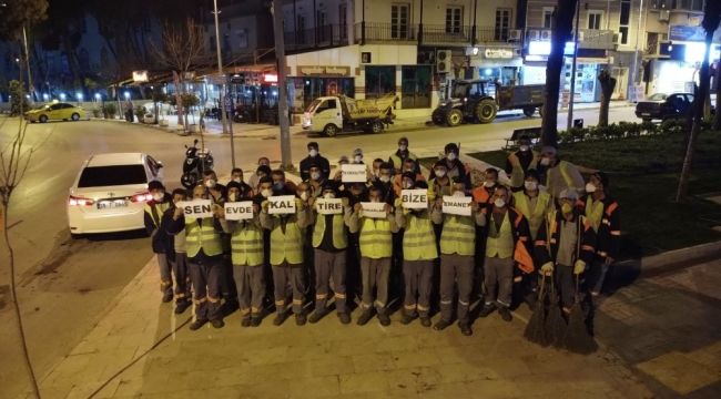 İzmir'de, Tire Belediyesine bağlı Temizlik İşleri Müdürlüğünde görevli temizlik işçileri, korona virüsü ile mücadelede önemli rol oynarken, gün ağarıncaya kadar çalışan işçiler farkındalık oluşturmak için 'Sen evde kal Tire sokakları bize emanet' yazılı döviz açtı.