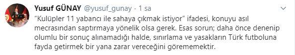 Sosyal medya hesabından açıklama yapan Günay, şu ifadeleri kullandı: “‘Kulüpler 11 yabancı ile sahaya çıkmak istiyor’ ifadesi, konuyu asıl mecrasından saptırmaya yönelik olsa gerek. Esas sorun; daha önce denenip olumlu bir sonuç alınamadığı halde, sınırlama ve yasakların Türk futboluna fayda getirmek bir yana zarar vereceğini görememektir.”