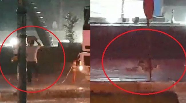 Görüntülerde yoldan geçmeye çalışan bir şahıs bir yandan ıslanmamak için elindeki çanta ile başını kapatırken bir yandan da seyir halindeki araçları kolluyor. Araçların gelmediğini gören şahıs, adımını atar atmaz yağmur suyu ile dolan çalışma alanına düşüyor. Boyuna kadar suya gömülen şahıs, olayın şoku ile aniden sudan çıkıyor. O anları görüntüleyen vatandaşlar ise bir süre güldükten sonra diğer yayaları uyararak karşıya geçmemeleri için bağırıyor.
