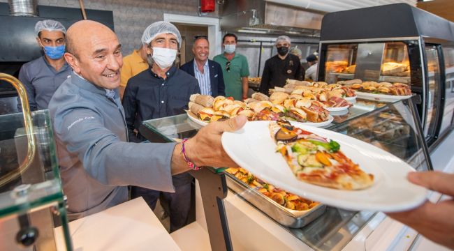 Başkan Tunç Soyer, Grand Plaza A.Ş. Genel Müdürü Hasan İkat ile birlikte Yasemin Kafe'yi gezdi ve bilgi aldı. Soyer'e üzerinde isminin yazdığı bir aşçı önlüğü hediye edildi.