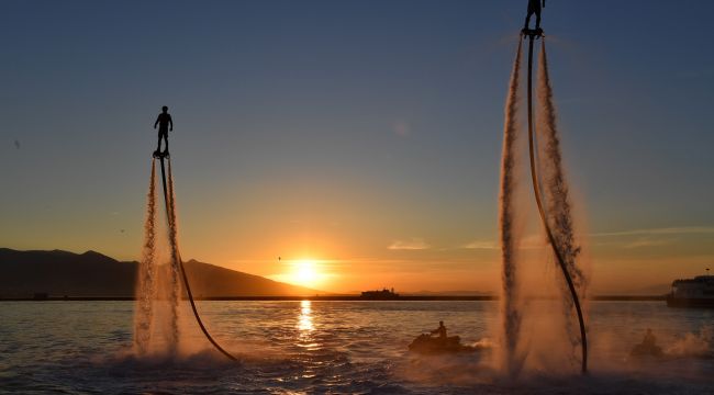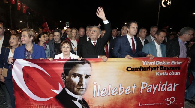 Cumhuriyet'in kenti İzmir'de, Büyükşehir Belediyesi tarafından Cumhuriyet’in 95. kuruluş yıldönümü etkinlikleri büyüleyici finalle son buldu. Gece geç saatlere kadar süren ve sokaklara taşan Cumhuriyet kutlamaları, fener alayı yürüyüşü ile başladı. İzmir Büyükşehir Belediye Başkanı Aziz Kocaoğlu, eşi Dr. Türkegül Kocaoğlu, belediye başkanları, sivil toplum örgütü temsilcileri ve toplumun her kesiminden binlerce İzmirli, kol kola girerek marşlar eşliğinde Cumhuriyet Meydanı'ndan Gündoğdu Meydanı'na kadar yürüdü. İzmirliler, 350 metrelik Türk Bayrağını "kutsal bir emanet" gibi özenle tutarak Cumhuriyet Meydanı’ndan Gündoğdu Meydanı’na taşıdı. İzmir Büyükşehir Belediye Bandosu da çaldığı marşlarla yürüyüşe eşlik etti. Geceye görkemli havai fişek ve ışık gösterileri damga vurdu. Birin ci Kordon, Türk bayrakları ile kırmızıya boyandı. Gündoğdu Meydanı’nda İzmirliler büyük bir sürpriz ile karşılaştı. Deniz suyunu güçlü motorlarla iterek uçmayı sağlayan flyboardlar ise Gündoğdu sahilindeki ışıklı gösterileriyle nefesleri kesti.