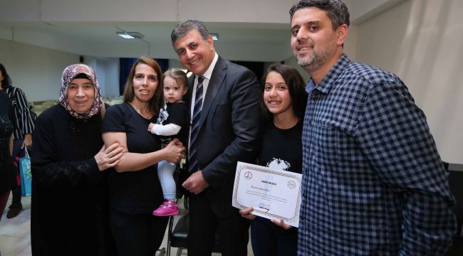 KARGEM’de gerçekleştirilen ödül törenine karşıyaka Belediye Başkanı Cemil Tugay, merkez yöneticileri, öğretmenler, öğrenciler ve velilerin yanı sıra Yeni Kuşak Köy Enstitülüler Derneği Karşıyaka Şube Başkanı Yılmaz Tekeli ile İzmir Kent Konseyleri Birliği üyeleri de katıldı. Törende; merkezde eğitim gören ve yıl içinde yapılan tüm sınavların ortalamasına göre en üst sıralarda yer alan 5, 6, 7. sınıf düzeyindeki toplam 30 öğrenciye takdir belgeleri ile çeşitli hediyeler verildi. Başkan Tugay’ın elinden ödüllerini alan çocuklar, sevinç ve heyecan dolu anlar yaşadı.